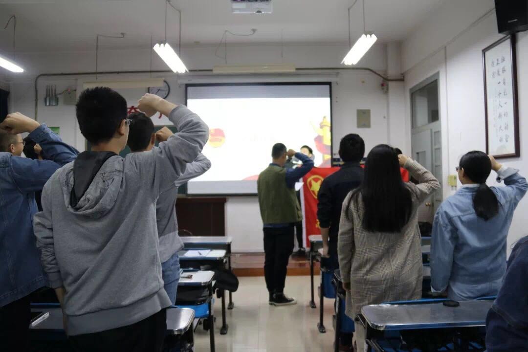 随后,全体团员在主持人的带领下重温入团誓词。在鲜红的团旗下,全体团员佩戴团徽,举起右手、紧握拳头,庄严宣誓。
