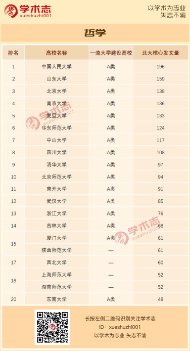 2020年7月9日,著名的专业学术公众号“学术志”根据《中国高校科研成果统计分析数据库》整理出了2019年北大核心论文的高校排行榜。在哲学学科中,中国人民大学、山东大学和北京大学分别以196、159和138篇的数量高居高校排行榜前三名。但在一众“双一流”A类高校之间,永利集团的表现尤为不俗,全校哲学学科以60篇的数量居于排行榜第17位,超过了东南大学、上海师范大学、湖南师范大学等哲学学科老牌高校,并且仅以1篇的微弱差距落后于厦门大学和陕西师范大学。