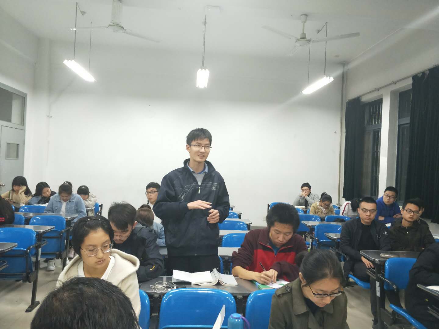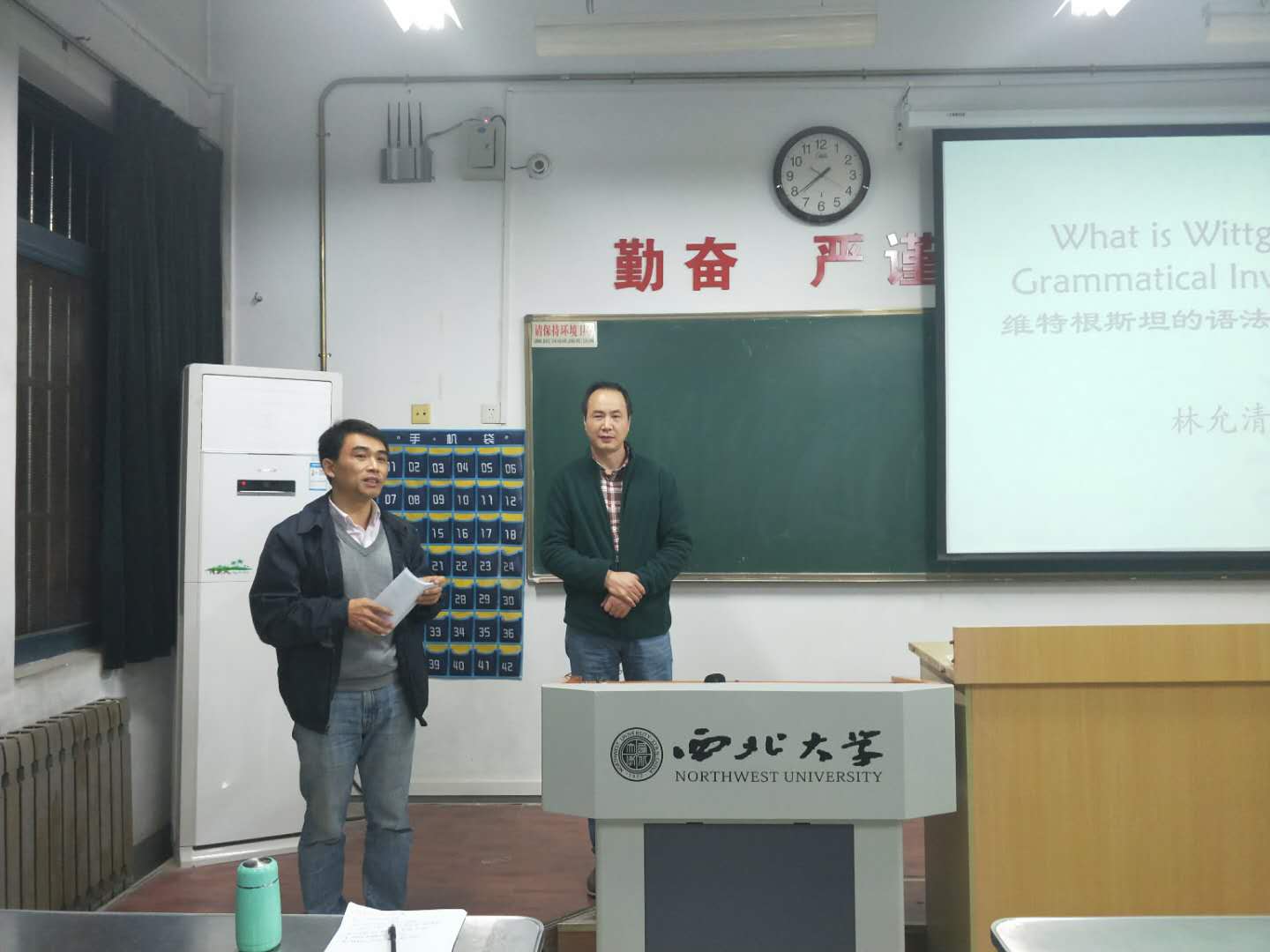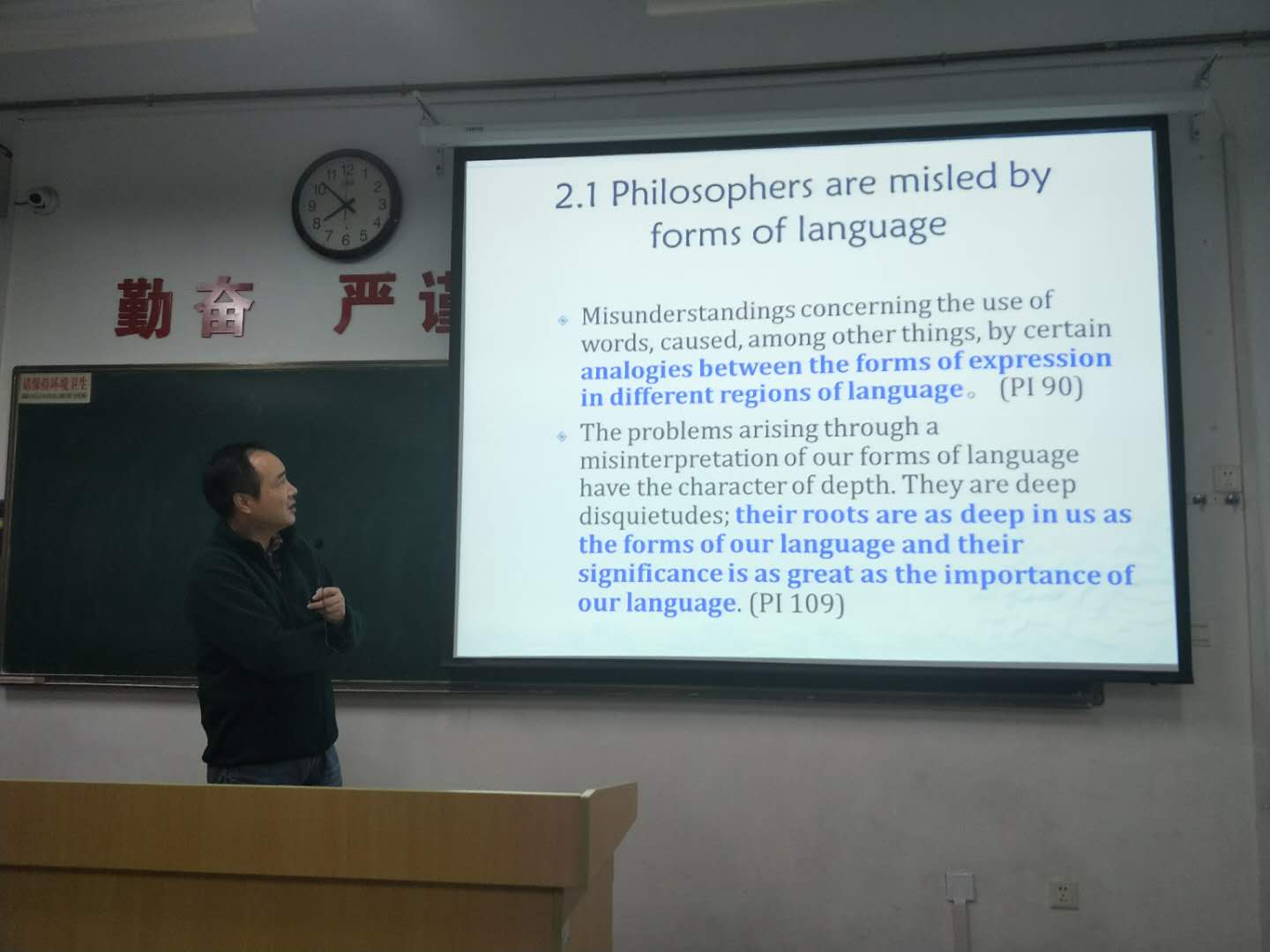 随后,林教授详细阐述了维特根斯坦后期的哲学理念。一言以蔽之,维特根斯坦认为,传统哲学家由于受到语法形式的误导,在思考问题时有所偏失,于是产生出诸多哲学问题,但这些哲学问题并不真实存在,因此永远不可能找到答案。是故,哲学家们应该做的,是指出这些问题的虚假性,进而放弃这种无意义的寻找答案之徒劳。之间所采取的途径是语法分析,即对语言、语词进行分析和正确使用。其一,林教授通过对英文句组的分析,指出人们常会自然却错误地对语言形式进行类比,然而同一语言形式在不同领域的应用是千差万别的,不能因为形式的相同而轻率地认为其意义也相同。其二,林教授点明语法分析的三重特征:只是描述;不做假设;只说大家都同意的话。其三,林教授通过列举“Sudden understanding”、“Rule-following”、“Private language”三个例子,对语法分析进行了更为深入细致的讲解。在场师生也相应提出自己的疑惑和想法,林教授均一一给予准确精到的解答。
